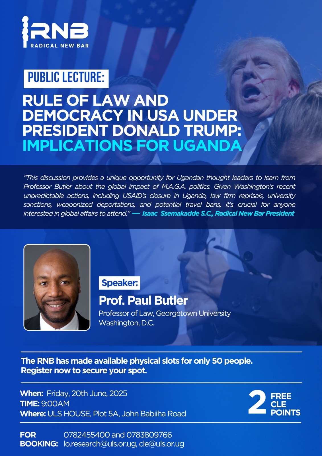 Professor Butler is expected to examine how Trump-era policies, particularly those shaped by the “Make America Great Again” (MAGA) movement, reshaped legal norms in the U.S. and how those shifts may resonate in jurisdictions like Uganda that rely on international partnerships and multilateral legal frameworks.