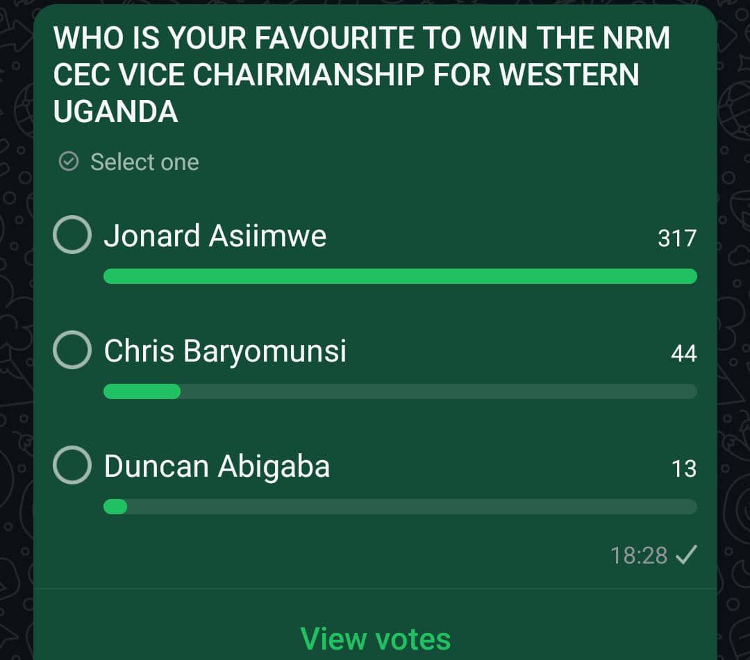 Although the WhatsApp poll results may not directly determine the outcome of the NRM Electoral college, it highlights a generational shift that is increasingly influencing the CEC elections, with young voters and first-time delegates rallying behind candidates they believe will bridge the gap between the NRM establishment and the grassroots.