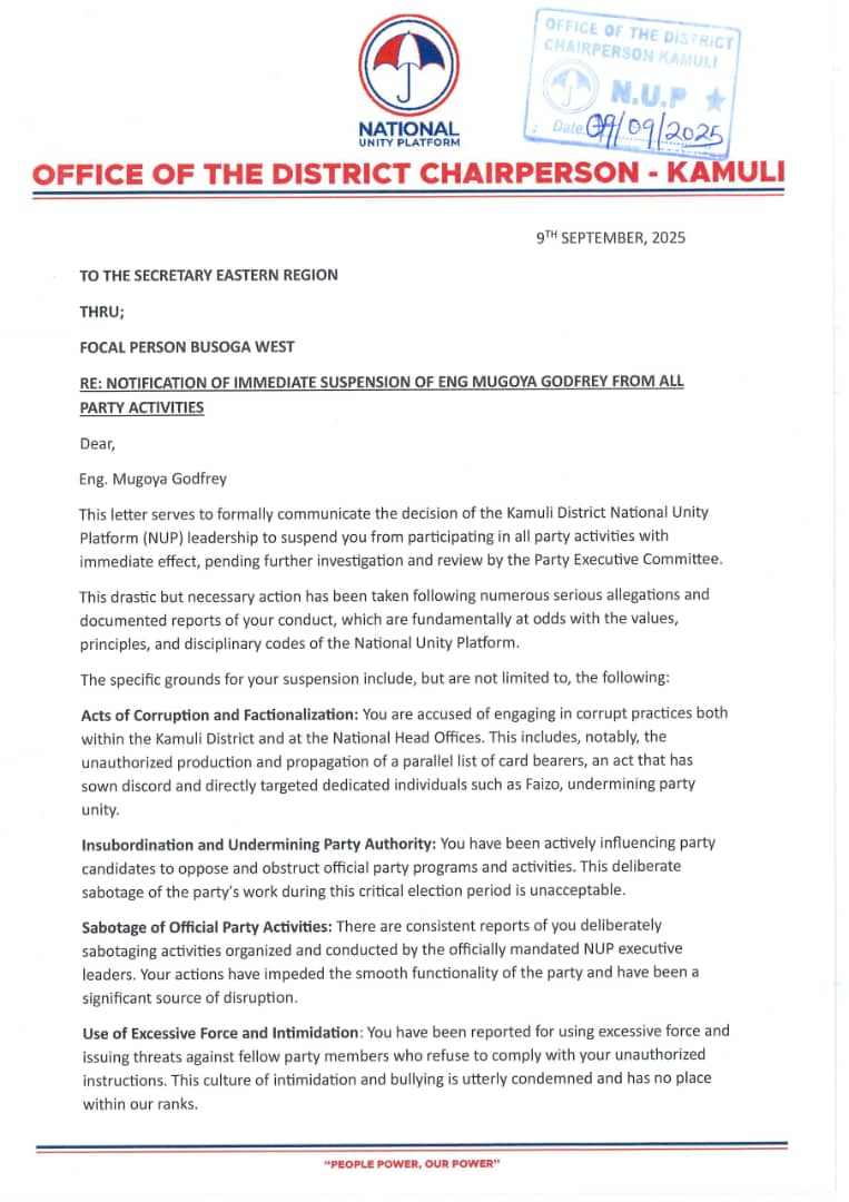 “You are hereby suspended from all NUP-related activities in Kamuli District until further notice. You are not to represent yourself as a party agent, mobiliser, or attend any party meeting or function,” the suspension letter reads in part.