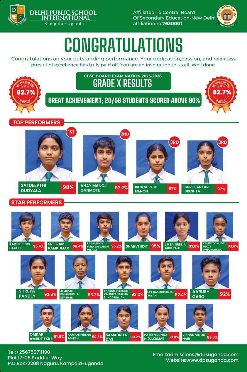 Kampala, Uganda: Delhi Public School International Kampala has posted strong results in the 2025/2026 Central Board of Secondary Education (CBSE) Grade 10 examinations, with one in three candidates scoring above 90 percent.
