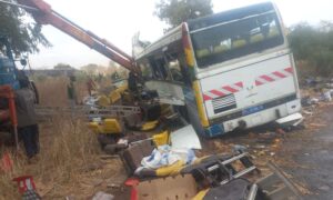 Images of the tragic incident showed the completely mangled front end of a white bus, with blood-flecked seats, personal items and a...